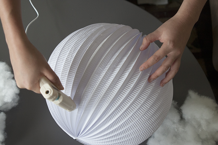 1. Vezmite si lepiacu pištoľ, nanášajte horúce lepidlo na lampión a zároveň priliepajte vatu. Nezabudnite, že vatu musíte nanášať rýchlo, kým vám lepidlo nezaschne.