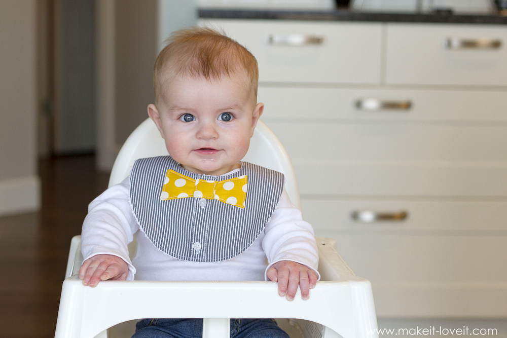 4. Podľa toho či je podbradník určený pre malú slečnu alebo malého pána, môžete na jeho hornú časť prišiť aplikáciu zo zbytku ľubovoľnej látky v tvare mašličky alebo motýlika.