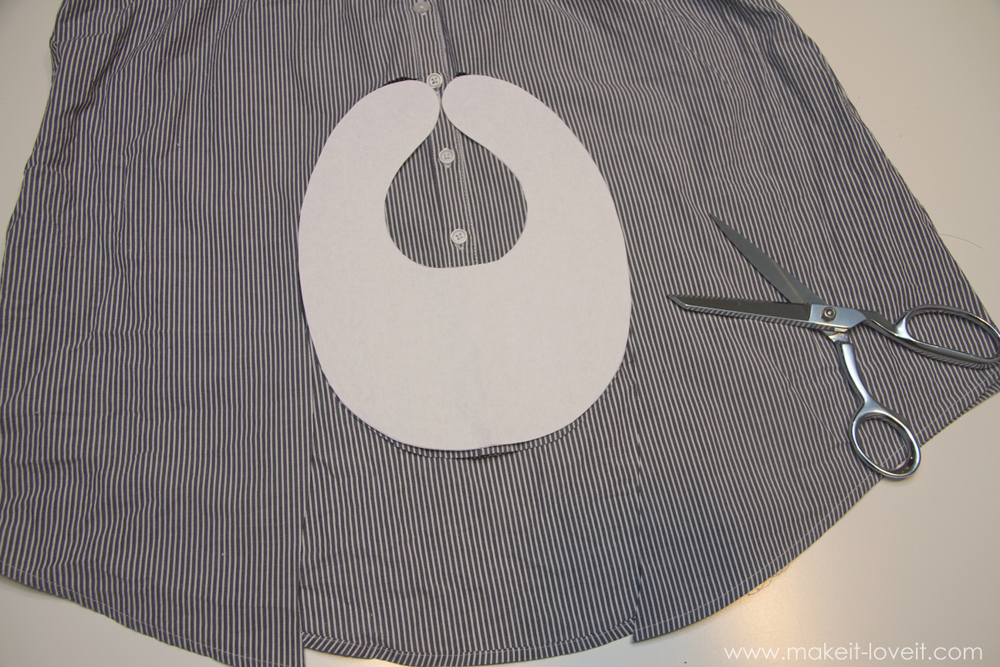 1. Na papier si nakreslite tvar jedného z podbradníkov ktoré máte doma. Preneste na košeľu v časti s gombíkmi a vystrihnite. Ten istý tvar vystrihnite z froté látky.