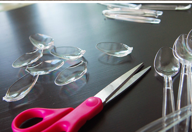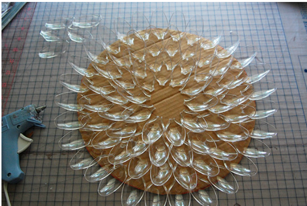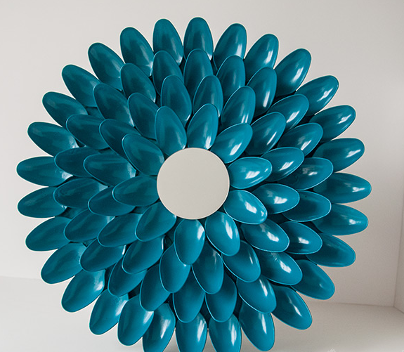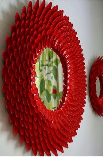 Z kartónu vyrežeme kruh s dostatočným priemerom na to, aby držal zrkadlo aj rám. Z plastových lyžičiek odstrihneme oválne časti a postupne ich lepíme na kartón. Je dôležité, aby sme začali s vonkajšou vrstvou, pretože lyžičky sa musia prekrývať. Zároveň ich nalepíme tak, aby pretŕčali cez kartón, a tak ho zakryli. V strede kartóna necháme miesto pre nalepenie zrkadla. Následne lyžičky nastriekame farebným sprejom a počkáme, kým farba dôkladne zaschne. Nakoniec nalepíme do stredu guľaté zrkadlo. Výsledok našej práce môžeme na stenu pripevniť stužkou, nalepenou zo zadnej strany alebo obojstrannou lepiacou páskou.